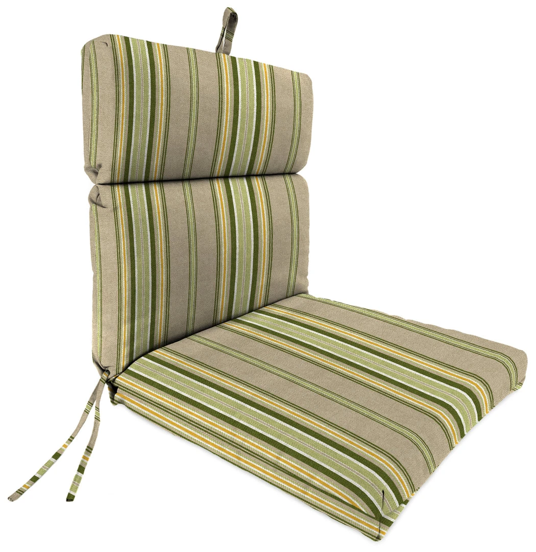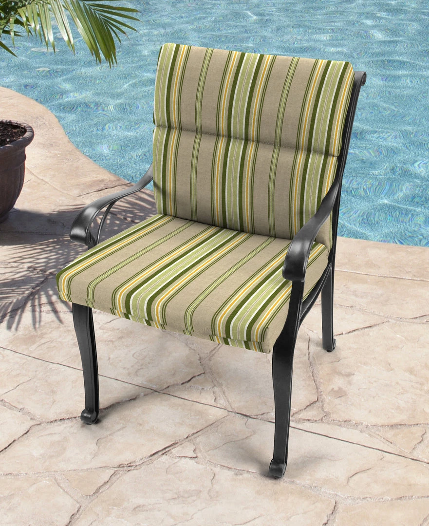 Bring additional style and comfort to your patio decor with our Outdoor French edge dining chair cushion from Jordan Manufacturing. This classic piece can be used to brighten up any outdoor seating area for the utmost comfort. Its larger size serves as a casual seat when the guest list suddenly grows. 100% polyester material makes for a high-performance fabric with its weather-, fade- and water-resistant qualities, making for the perfect piece to put outdoors. From elaborate dining spaces to cozy three-season porches, this fiber-filled cushion boosts your space with carefree, laid-back style and total comfort.