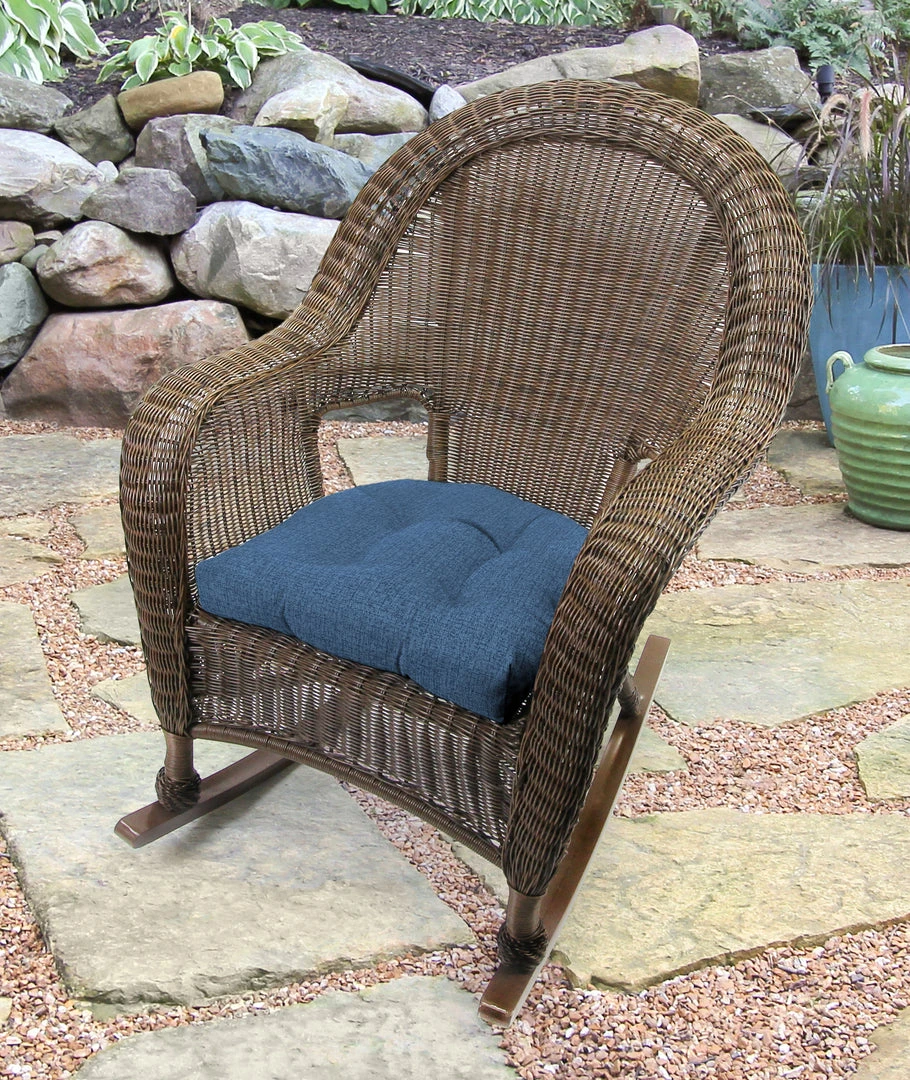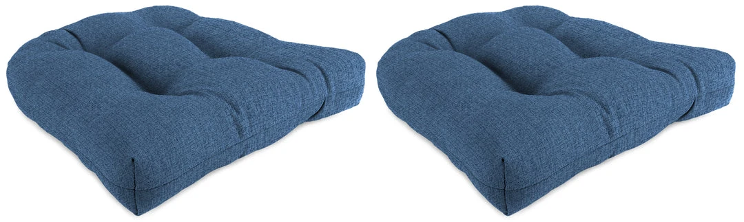 Outdoor Knife Edge Wicker seat cushion; Sold in Set of 2; UV protection allows cushion to withstand up to 500 hours of direct sunlight; Filled with dense hypoallergenic spun polyester fiber; Weather resistant polyester fabric that is engineered to withstand mold, mildew, & stains; Overall dimensions: 18Wx18Lx4H