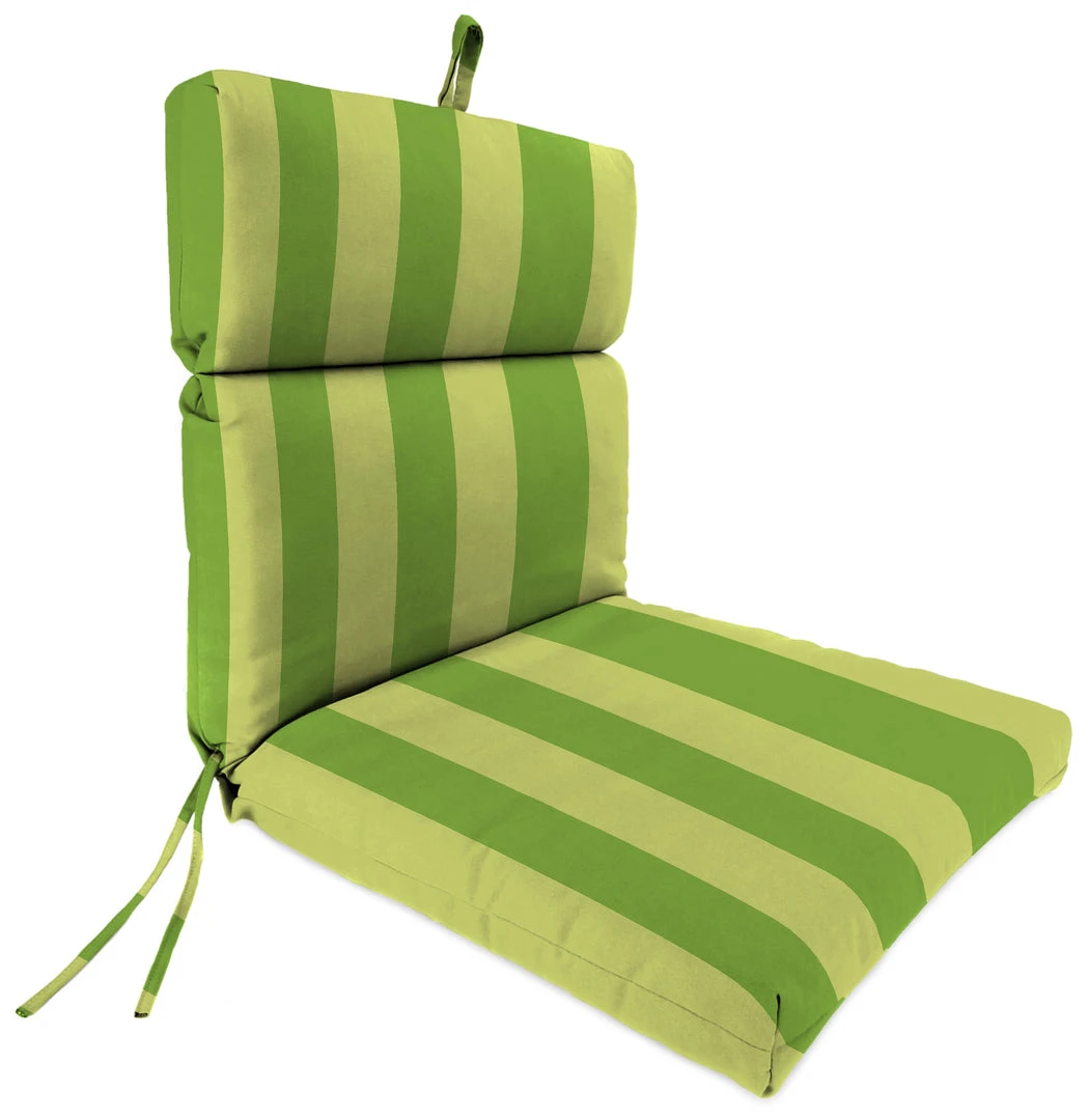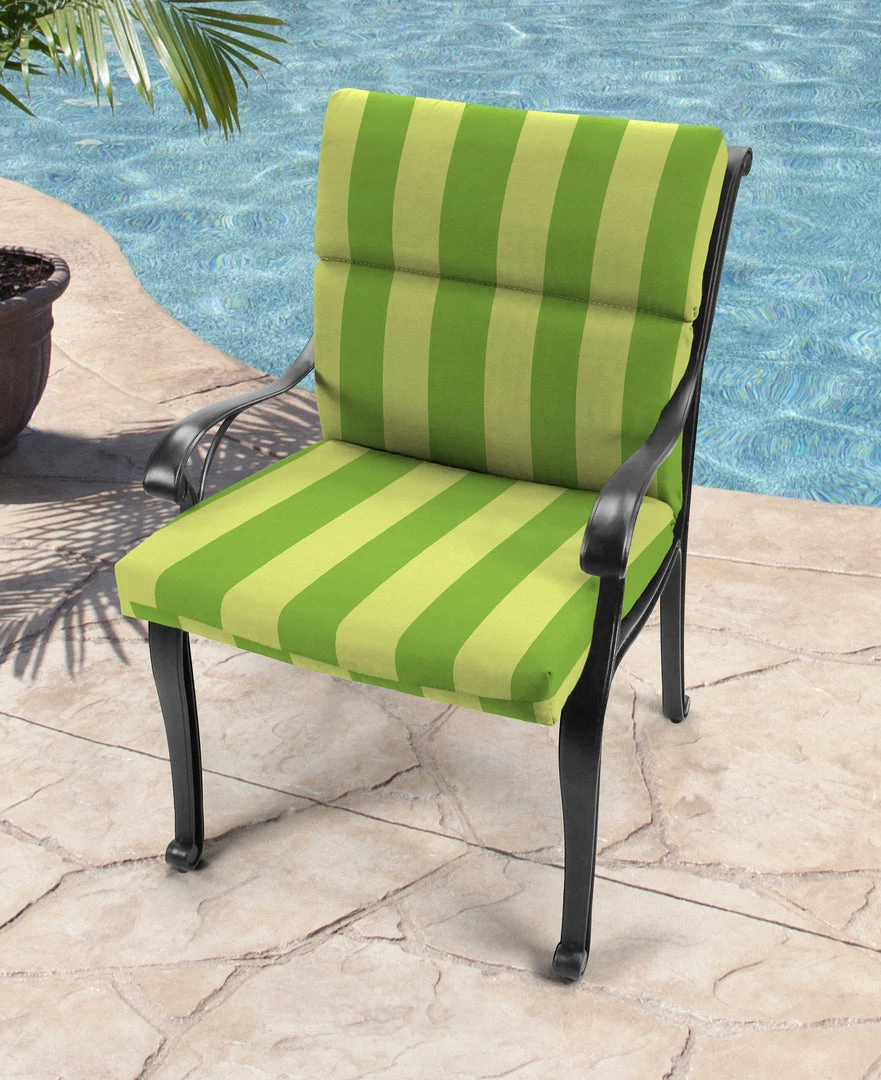 Outdoor French edge dining chair cushion; UV protection allows cushion to withstand up to 500 hours of direct sunlight; Filled with dense hypoallergenic layered fiber; Weather resistant polyester fabric that is engineered to withstand mold, mildew, & stains; Overall dimensions: 22Wx44Lx4H; Seat dimensions: 22Wx22L; Back dimensions: 22Wx22L with 9.5″ head hinge; Matching ties for a secure fit and hanger loop for easy storage