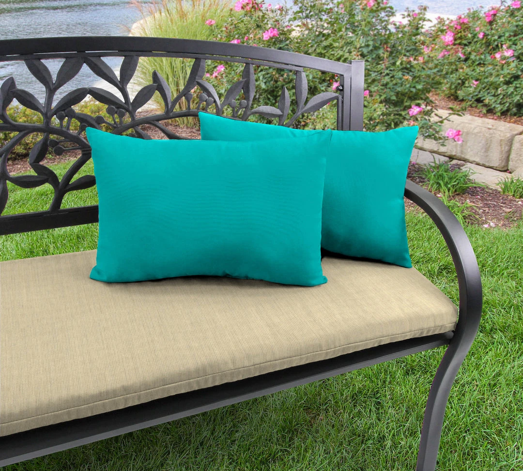 Add a touch of color to your outdoor seating area with this set of 2 Outdoor Lumbar Throw Pillows from Jordan Manufacturing. Crafted from a quick-drying, UV- and water-resistant fabric, these outdoor pillows withstand sun exposure and the elements to last for the seasons to come. Stuffed with hypoallergenic polyester fiber fill for an extra cushy and soft experience while relaxing. From elaborate dining spaces to cozy three-season porches, these fiber-filled throw pillows boosts your space with carefree, laid-back style and total comfort.
