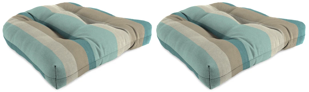 Outdoor Knife Edge Wicker seat cushion; Sold in Set of 2; UV protection allows cushion to withstand up to 1000 hours of direct sunlight; Filled with dense hypoallergenic spun polyester fiber; Weather resistant Sunbrella acrylic fabric that is engineered to withstand mold, mildew, & stains; Overall dimensions: 18Wx18Lx4H