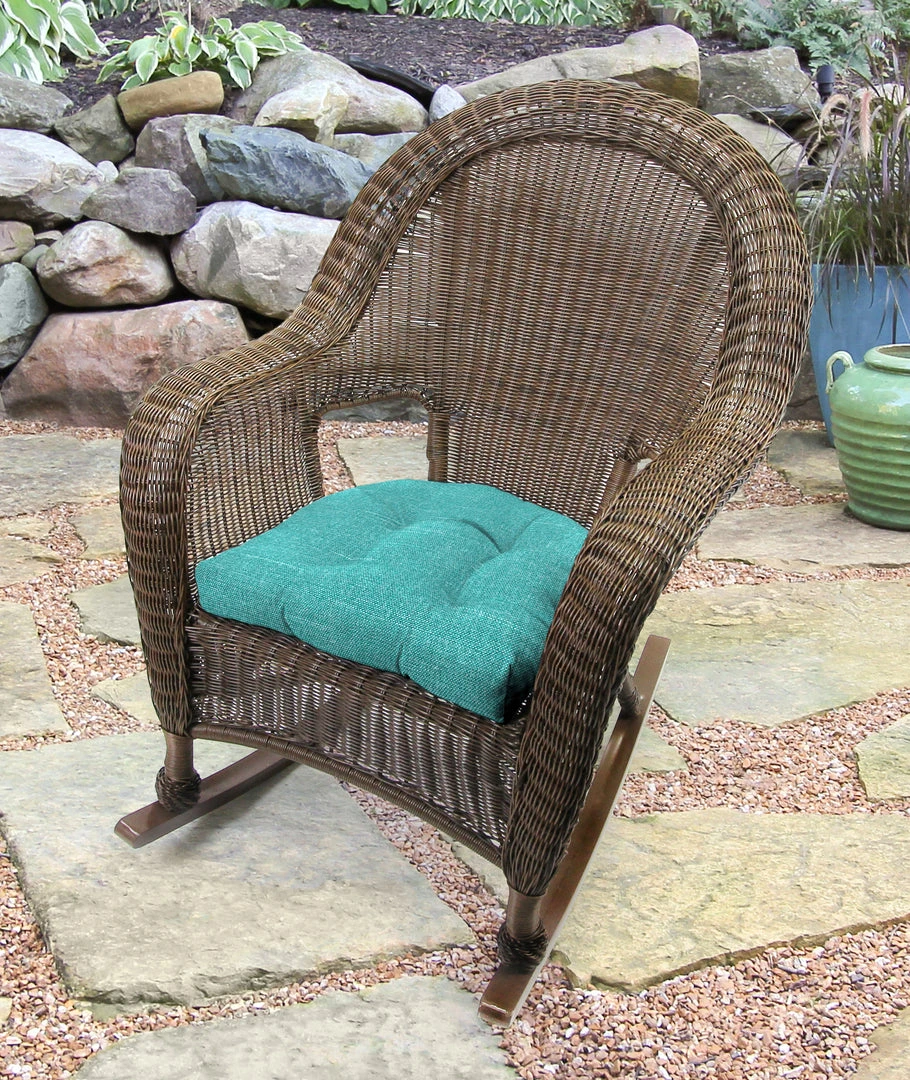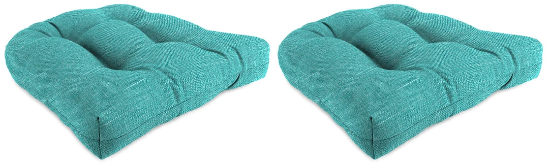 Outdoor Knife Edge Wicker seat cushion; Sold in Set of 2; UV protection allows cushion to withstand up to 500 hours of direct sunlight; Filled with dense hypoallergenic spun polyester fiber; Weather resistant polyester fabric that is engineered to withstand mold, mildew, & stains; Overall dimensions: 18Wx18Lx4H