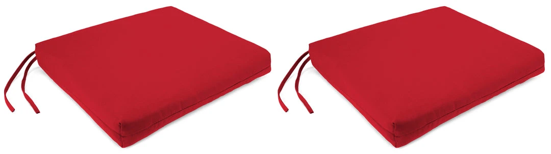 Outdoor French Edge seat cushion; Sold in Set of 2; UV protection allows cushion to withstand up to 1000 hours of direct sunlight; Filled with dense hypoallergenic layered fiber; Weather resistant Sunbrella acrylic fabric that is engineered to withstand mold, mildew, & stains; Overall dimensions: 19Wx17Lx2H; Matching ties for a secure fit